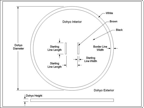 - The outer edge of the dohyo, the border line, is indicated as a white circular ring with a width as defined in the table above with an outside diameter equal to the diameter of the dohyo.